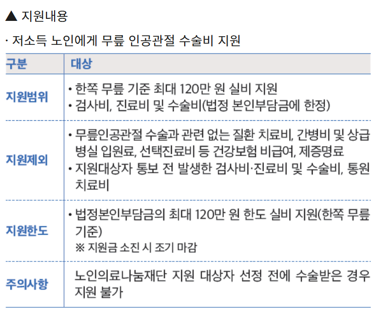 이 지원사업은 노인분들이 무릎 인공관절 수술을 받을 때 발생하는 비용을 지원하는 프로그램입니다.