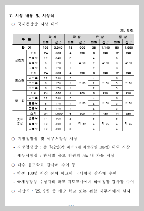 시상 시기: 2025년 9월 중 해당 학교 또는 관할 세무서에서 시상 예정