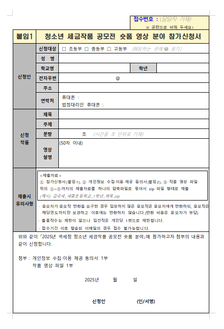 숏폼 영상 분야의 경우, 참가신청서와 개인정보 동의서를 함께 제출해야 합니다.