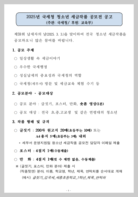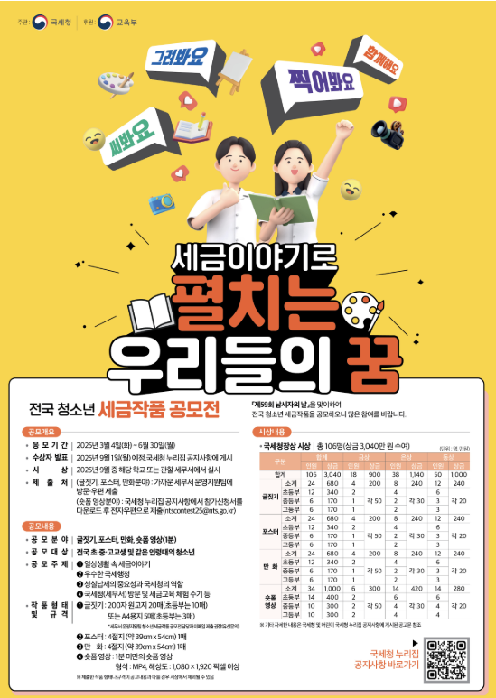국세청이 주최하는 '2025년 청소년 세금작품 공모전'이 현재 진행 중입니다.