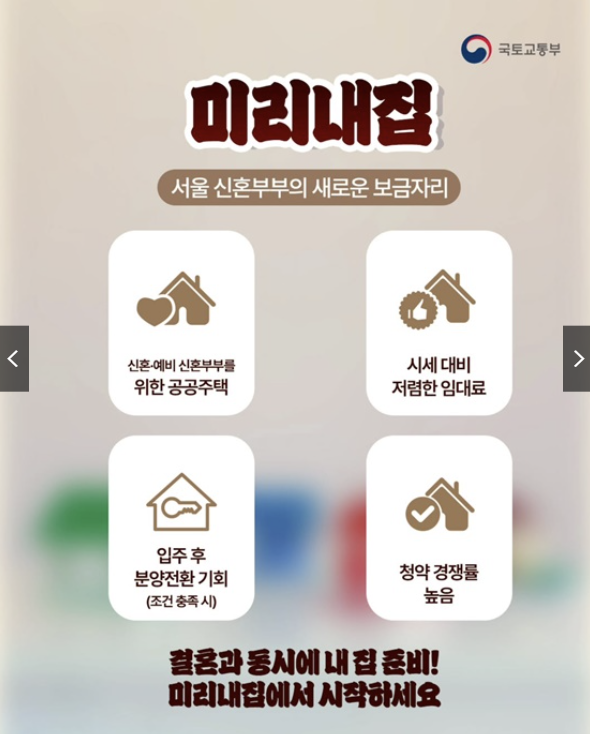 ‘미리내집’은 서울시에서 신혼부부 및 예비 신혼부부를 대상으로 공급하는 분양 전환형 공공임대주택입니다.