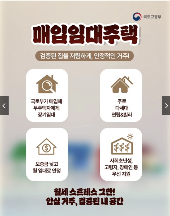 ‘매입임대주택’은 국토교통부가 다세대주택이나 연립주택 등을 매입한 뒤, 무주택자에게 저렴하게 임대하는 방식입니다.