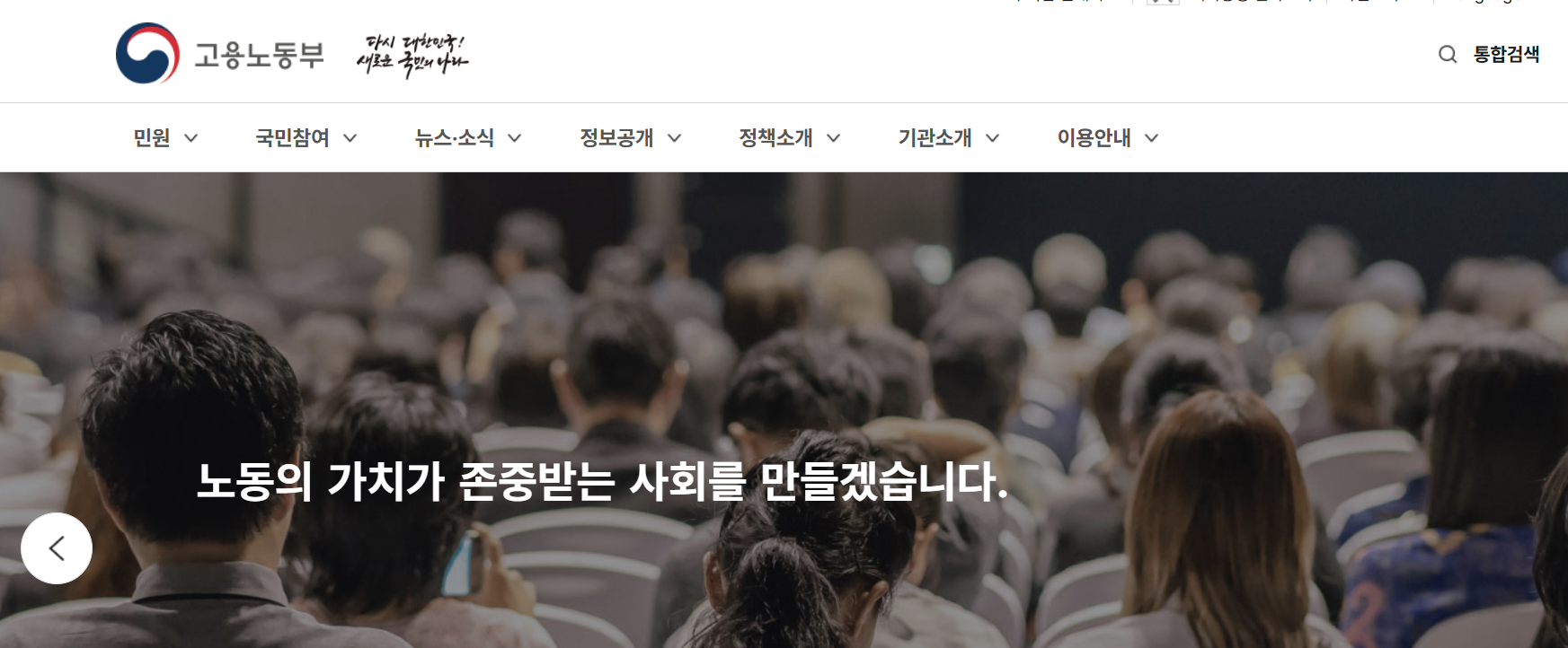 지속가능하고 미래지향적인 노동시장 구축 일자리 기회는 확대하고 일터 문화는 혁신 노동의 가치가 존중받는 사회를 만들겠습니다. 이전 슬라이드 다음 슬라이드 자동 넘김 정지 자동 넘김 재