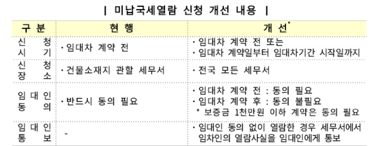 이 제도는 임대인의 동의 없이도 세무서를 통해 해당 임대인의 국세 체납 내역을 열람할 수 있도록 해, 임대인의 경제적 신용상태를 사전에 파악할 수 있는 제도입니다.